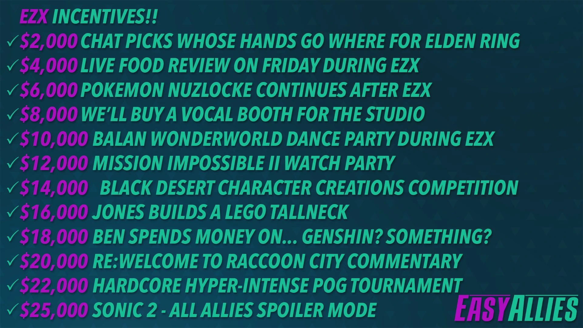 In early March 2022, Easy Allies announced EZX 2022, their six-year anniversary weeklong celebration and the third annual EZX event. The event kicked off on March 21 and was the first EZX to take place in The Studio. Events included an EZA fundraiser with fundraising goals along with the announcement of Phase Infinity. Numerous fundraising goals were revealed and they raised more than $26,000 for their EZX fundraiser and reached over $34,000 per month on Patreon. Similar to EZX Digital '21, an EZX 2022 Bonus Tracker[34] was posted on Patreon with continual updates planned as incentives get produced over the coming weeks.
